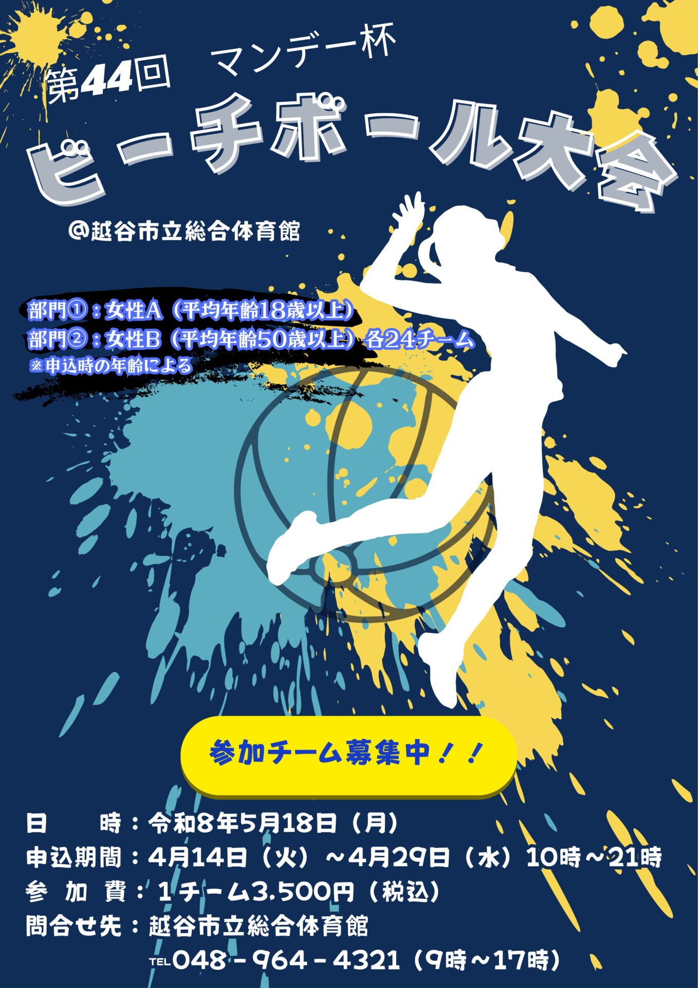 | 申し込み | 募集期間:2026年4月14日(火)~4月29日(水) 午前10時から午後9時まで 女性A(平均年齢18歳以上) 24チーム 女性B(平均年齢50歳以上) 24チーム ※コート内に入る選手の平均年齢も各カテゴリーに合うようにして下さい。 ☆記入していただく事項☆ チーム名(8文字以内、!と?以外の記号不可)・出場選手の住所・氏名・年齢 チーム責任者及びその他1名の連絡先・監督・主将・主審のチェック 4月30日(木)午前11時より、総合体育館会議室にて組合せ抽選会を実施いたします (定員オーバーの部門があった場合は、参加抽選も同時に行います)。 参加費お支払い期間:5月1日(金)~5月12日(火) 午前10時から午後9時まで ※参加費を期間内にお支払いいただけない場合は参加資格を失いますので、ご注意ください。 |